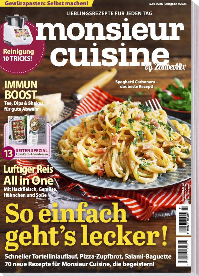 Zum Jahresauftakt haben wir darüber hinaus ein paar clevere Küchenhacks für dich. Ab Seite 54 verraten wir die besten Tricks, wie du deinen Monsieur wieder auf Hochglanz bringt. Auf Seite 36 kochen wir superluftigen Reis, der dir mit dieser Schritt-für-Schritt-Anleitung immer auf den Punkt gelingt und auf Seite 15 erfährst du, wie die Trendzutat Linsen im Monsieur gegart wird.